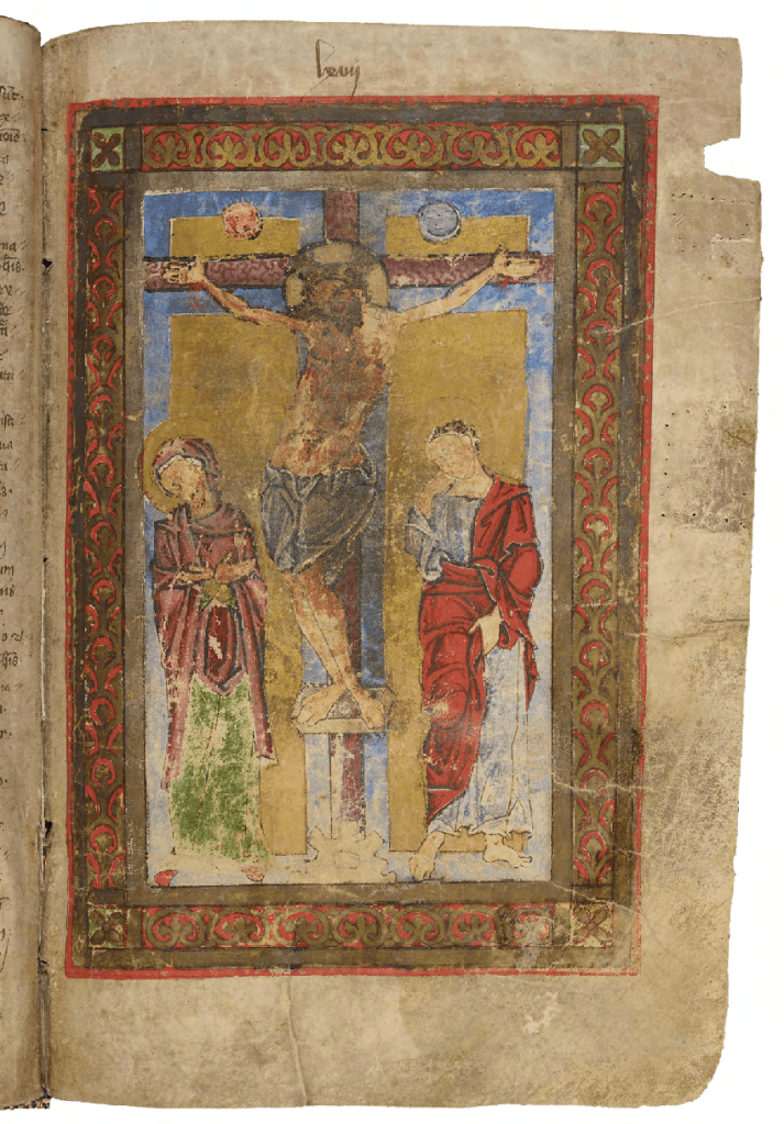 Crucifixion in a missal at the Canon, twelfth century with later additions, Augsburg. Oxford, Bodleian Library, Ms. Canon. Liturg. 354 fol. 67r (which is fol. Lxfij in the original foliation). From Kathryn Rudy’s Touching Parchment: How Medieval Users Rubbed, Handled, and Kissed Their Manuscripts